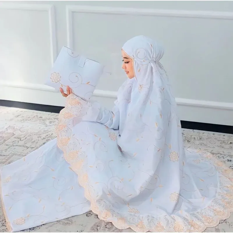 Mukena bagian atasan dikelilingi rendah bordir dan bagian muka pakai rendah dan kepala pakai tali ikat